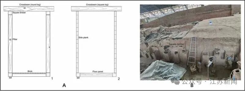 陪葬坑過洞主要木質框架結構示意圖(A1:兵馬俑坑;A2:K9901及K9801)及兵馬俑一號坑內炭化木質建築結構。秦始皇帝陵博物院供圖