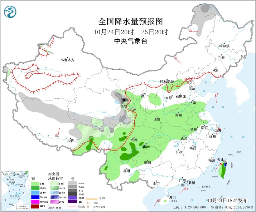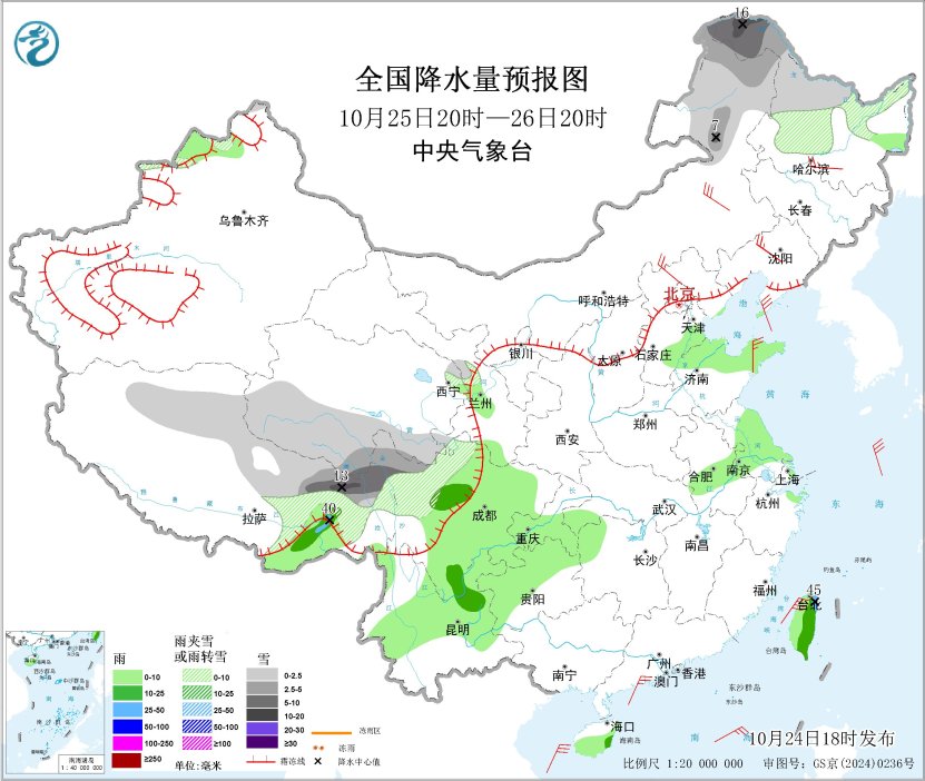 *10月24日20時至25日20時,*內蒙古東北部、黑龍江西北部、西藏北部和東部、青海東部和南部、甘肅中部和南部、川西高原北部等地部分地區有小到中雪或雨夾雪,其中,青海東部等地部分地區有大到暴雪,局地大暴雪(20~22毫米)。西藏東南部、四川中南部、重慶西部、雲南東北部、台灣島等地部分地區有中到大雨,其中,台灣島東北部等地局地有暴雨(50~60毫米)。內蒙古東北部和中部、西藏南部等地部分地區有5~6級風,台灣海峽、巴士海峽、南海北部部分海域有6~7級、陣風8級的大風(見圖1)。