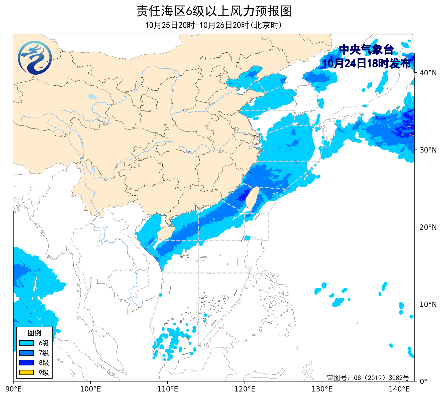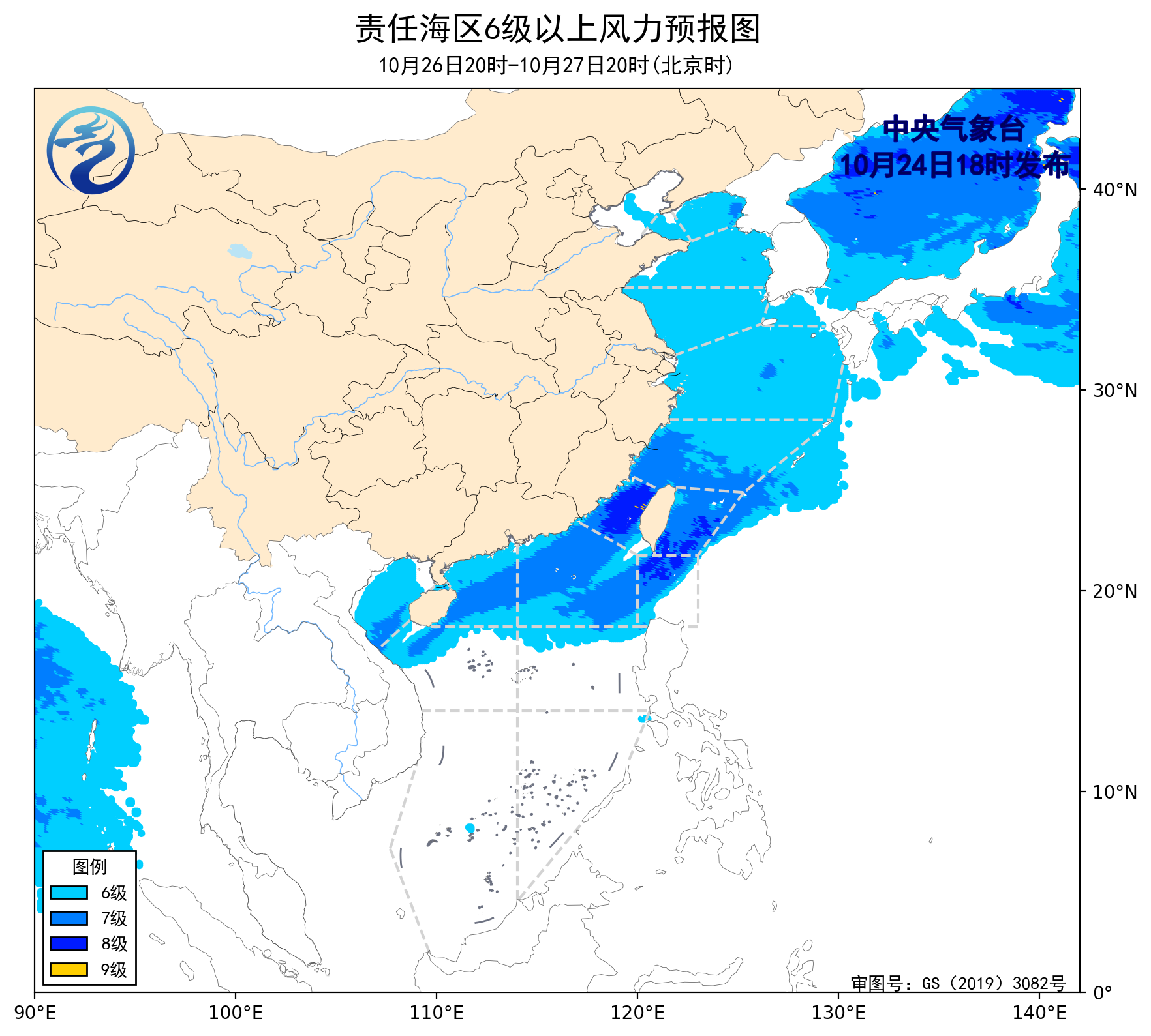 預計,10月27日夜間至10月30日夜間,渤海、渤海海峽將有5~6級、陣風7級的風,黃海大部海域、北部灣、瓊州海峽將有6~7級、陣風8級的風,東海大部海域、南海大部海域將有6~8級、陣風9級的大風,台灣海峽、台灣以東洋麪將有8~9級、陣風10級的大風,巴士海峽將有7~8級、陣風9級的大風。