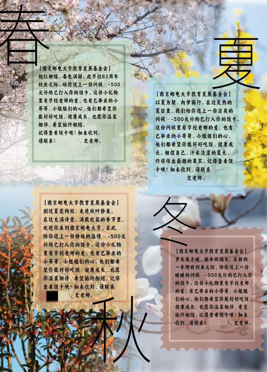 這是南京郵電大學教育發展基金會“柚子飯卡”公益項目第19批送上的關懷,30名同學成為這一季的温暖接收者。