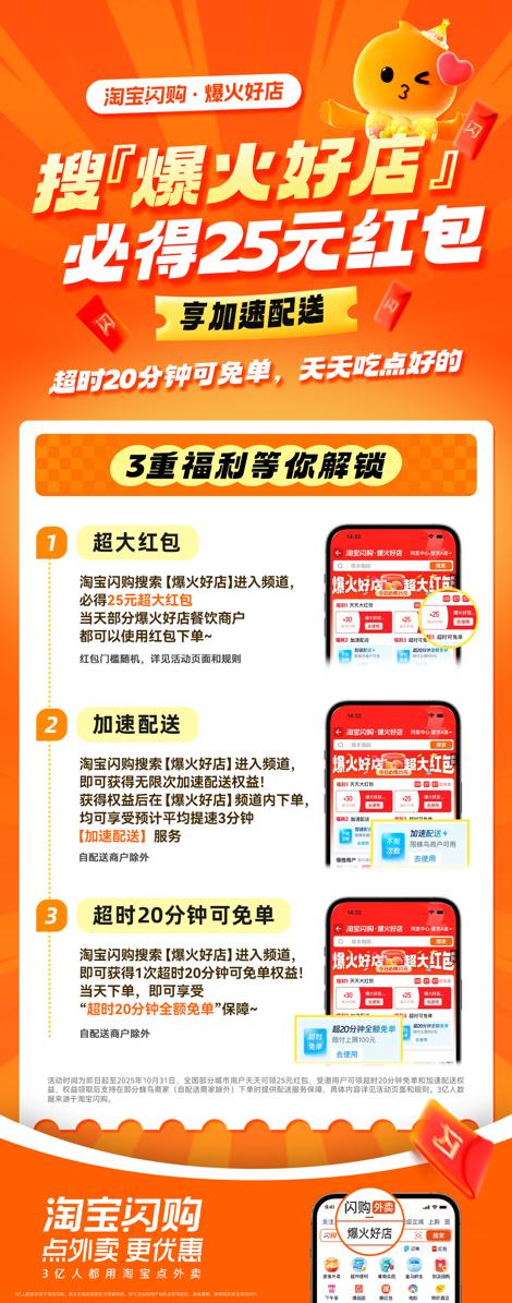 伴隨天貓“雙11”正式開售,淘寶閃購近日持續加碼服務,不斷升級用户體驗。繼推出“25元大額紅包”“超時20分鐘免單”之後,今日淘寶閃購再宣佈,針對“爆火好店”頻道推出“加速配送”服務,用户訂單預計平均可提速3分鐘。