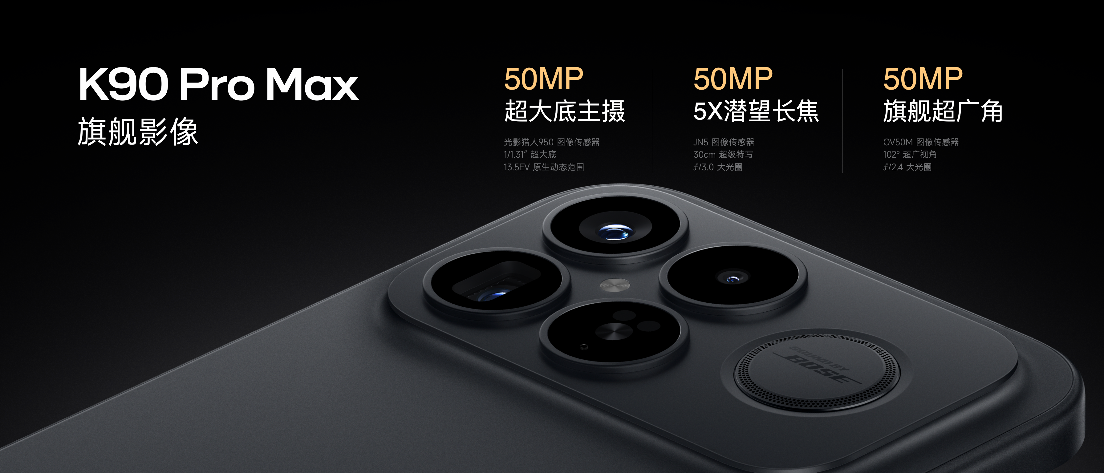 音頻方面,REDMI與Bose達成深度合作,K90系列為雙方合作首秀。K90 Pro Max搭載雙方共同打造的三揚聲器聲學系統,構建全鏈路2.1聲道,結合Bose六十年音頻技術積澱與Sound by Bose技術,實現低音飽滿、細節豐富、人聲清晰的沉浸式聲場體驗。