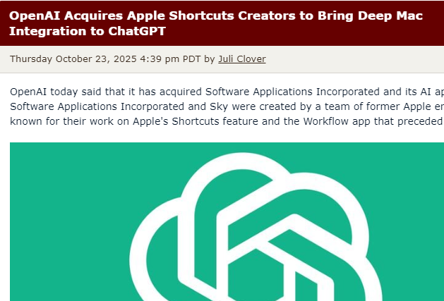 【環球網科技綜合報道】在推出對標Safari和Chrome的瀏覽器ChatGPT Atlas僅僅一天後,OpenAI再出重拳,於10月23日宣佈收購由前蘋果核心員工創立的Software Applications Incorporated公司及其AI應用Sky。外媒MacRumors指出,這一收購被視為OpenAI構建桌面AI生態的關鍵一步。