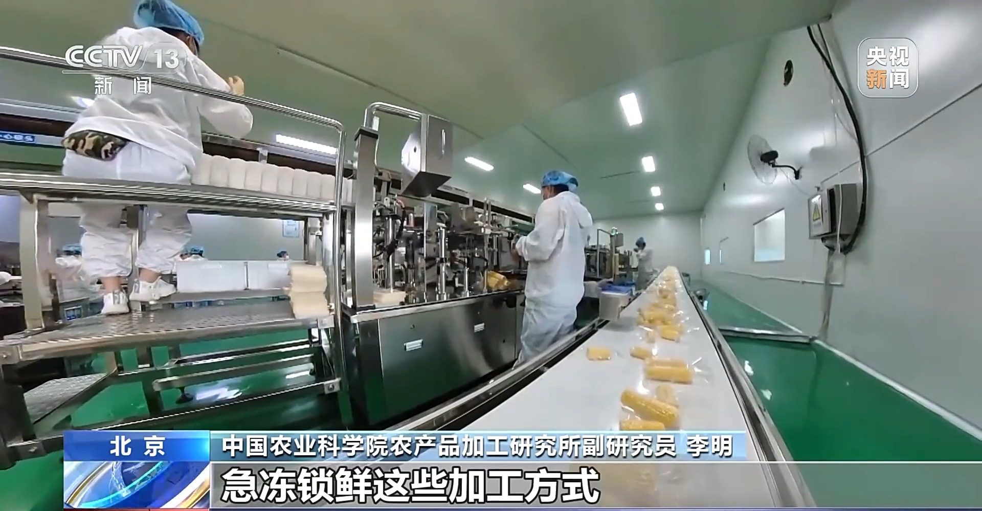 *中國農業科學院農產品加工研究所副研究員 李明:*凍存了兩個月的鮮食玉米,它的可溶性糖含量其實僅僅下降了10%到16%這樣的一個區間,蛋白質含量就是説也會有波動,但是下降也比較少,急凍鎖鮮這些加工方式就是為了保留玉米的營養物質。