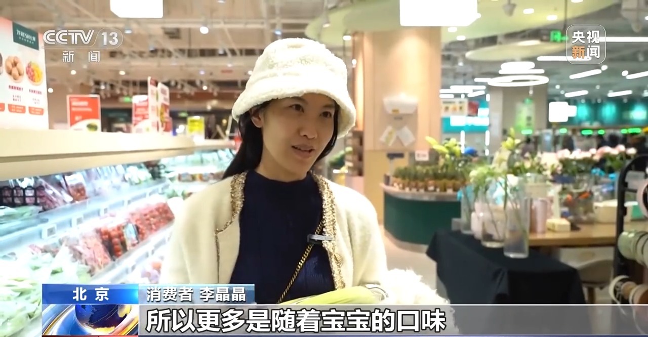 *消費者 李晶晶:*我們家有寶貝,所以更多是隨着寶寶的口味來搭配每天的餐食。冰糖玉米是我們家最喜歡的一種,它口感吃起來脆脆甜甜的。因為它是粗糧中這種口感比較好的,所以寶寶他的接受度比較高,營養比較豐富一點。