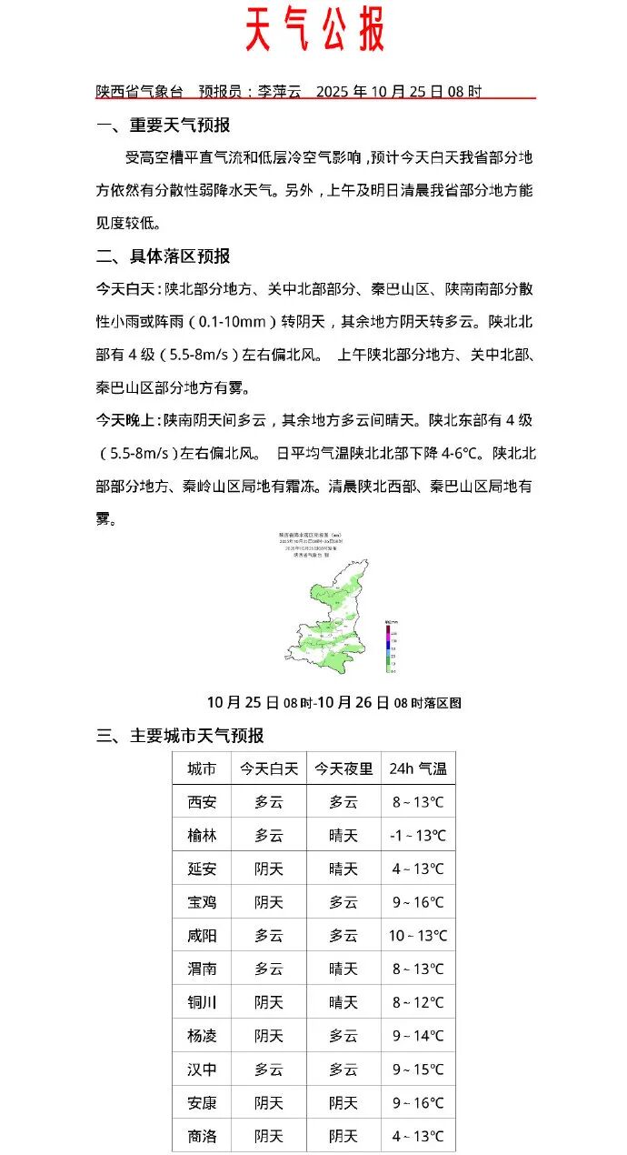 西安市氣象台2025年10月25日09時發佈天氣預報:預計今天下午起西安市轉為多雲天氣,*持續陰雨天氣結束;*夜間至明日清晨山區及河谷地帶有霧,能見度較低。氣温方面,今天起最高氣温逐步回升,後期最高氣温可升至18~21℃。