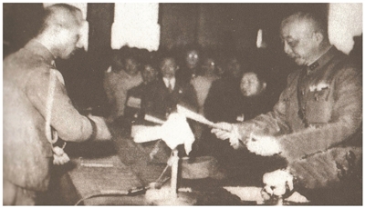 1945年10月25日,中國戰區台灣省受降主官陳儀(右一)接受日本投降代表的投降書。