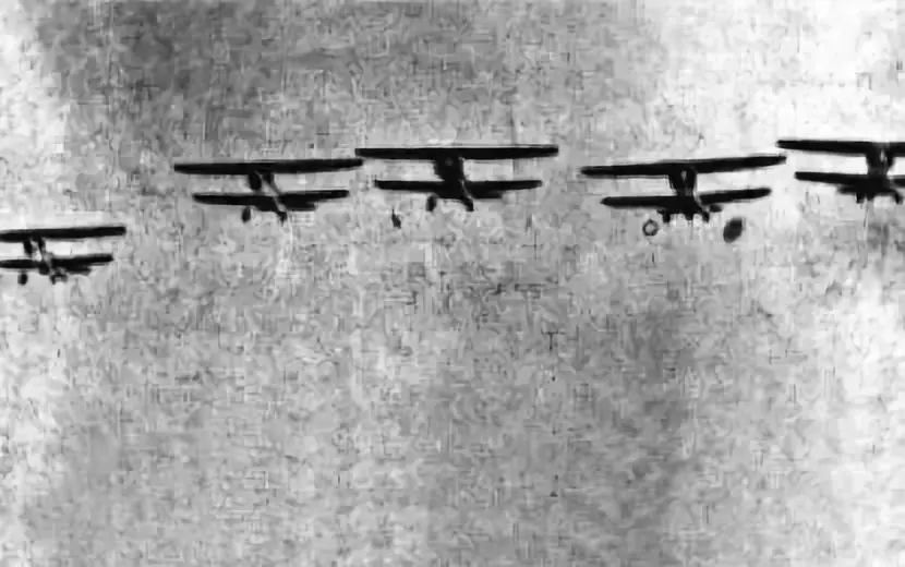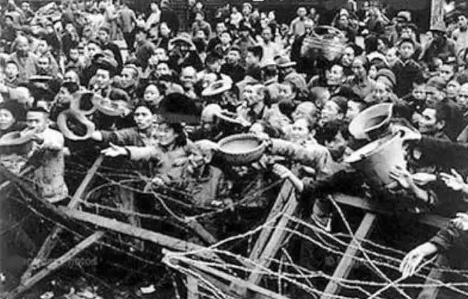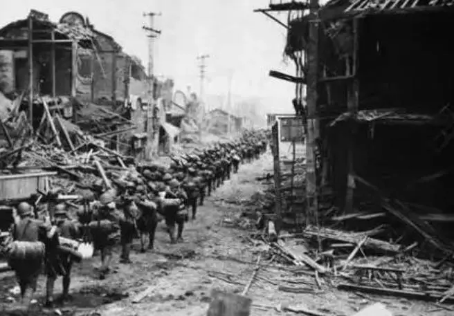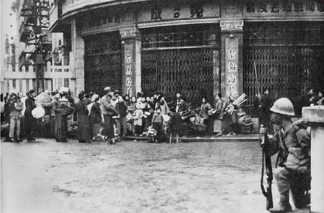 日軍佔領下的漢口中山大道,無辜的民眾被手拿刺刀的日軍驅趕。