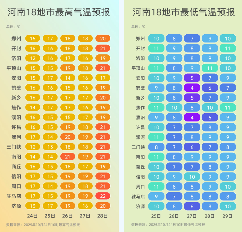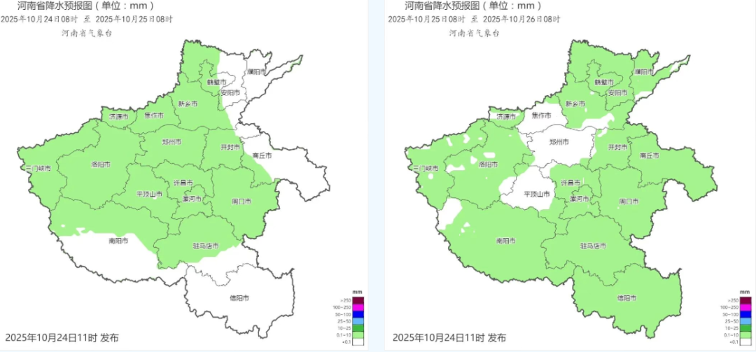 陰雨天氣在河南短暫上線,今天白天,河南省大部有小雨或零星下雨,降水強度不大,持續時間也比較短;今天夜間開始,我省將開啓一段乾燥少雨的時光,預計月底之前,我省天氣多為晴或多雲。充沛的陽光也使得氣温有了明顯的起色,週日起,我省大部的最高氣温回升至20度附近,秋日暖陽即將回歸;不過霜降節氣,往往是秋冬時節中晝夜温差最大的,早晚的寒涼較重,仍需注意保暖。