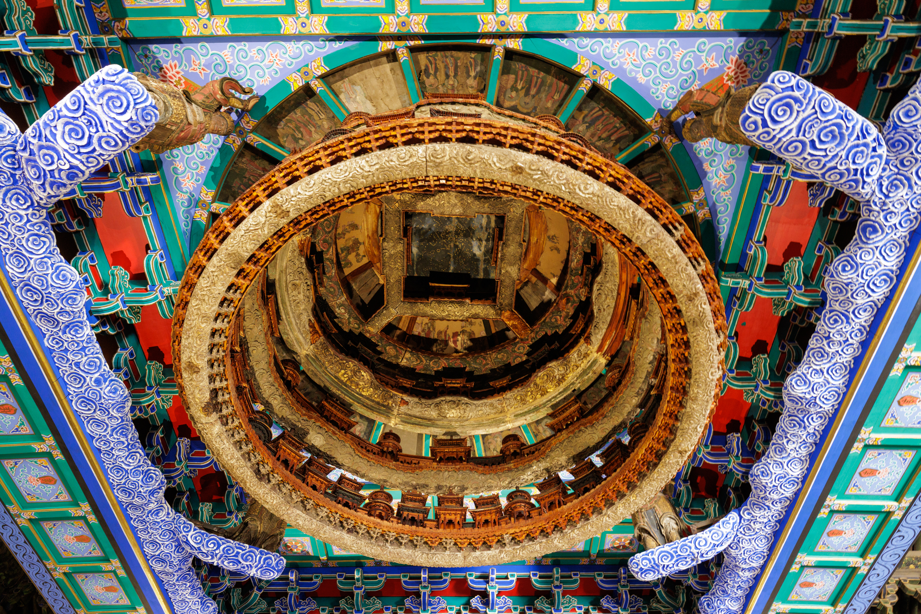 藻井是一種頂部呈穹隆狀的天花,是我國傳統建築中室內較高規格的裝修手法。“藻井”一詞最早見於漢賦,中國古代木建築易燃,飾以藻草寓意壓火,而井只取象形之義。它獨特的造型可以使室內的頂部獲得最大的空間。藻井在建築中的使用代表了尊貴與等級,一般置於寺廟所祀奉神像的頂部或宮殿寶座的上方。藻井的形制有四方、八方、圓井等。
