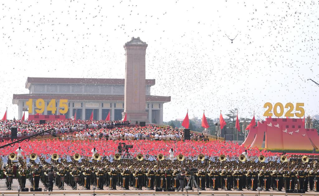 2025年9月3日,天安門廣場花團錦簇,旌旗飄揚。