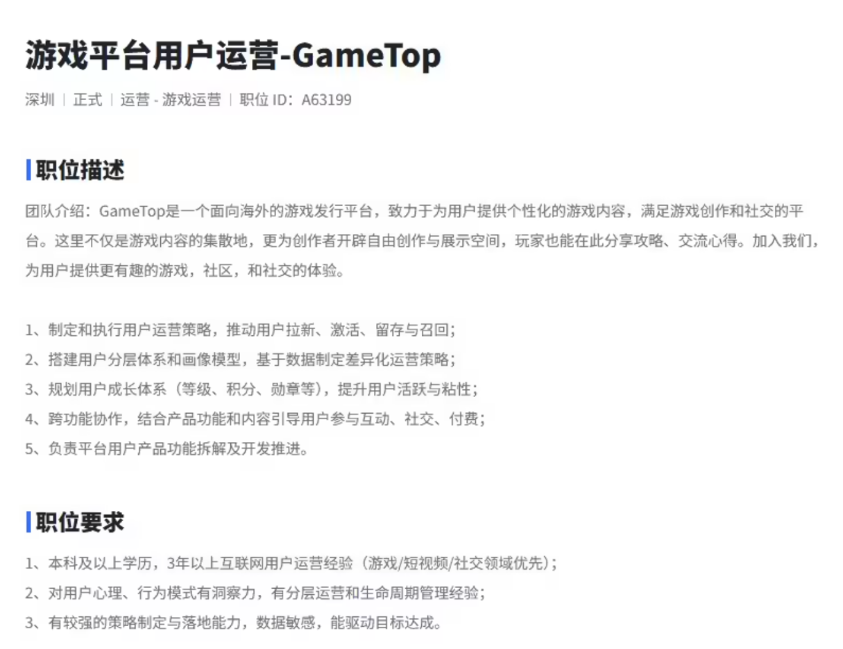 據瞭解,GameTop平台定位為面向海外用户的綜合性遊戲服務平台,核心目標是為用户提供個性化遊戲內容推薦,同時滿足遊戲創作者的工具需求與玩家的社交互動需求。目前,字節跳動已正式啓動GameTop平台的運營團隊招聘工作,招聘崗位聚焦用户運營核心能力,具體包括制定並執行用户拉新、激活、留存及召回全鏈路策略;搭建用户分層體系與畫像模型,基於數據驅動實現差異化運營;設計用户成長體系,涵蓋等級、積分、勳章等激勵機制以提升用户活躍度與粘性;此外還需聯動產品、內容等多部門,引導用户參與平台互動、社交及付費環節,構建完整用户生態。
