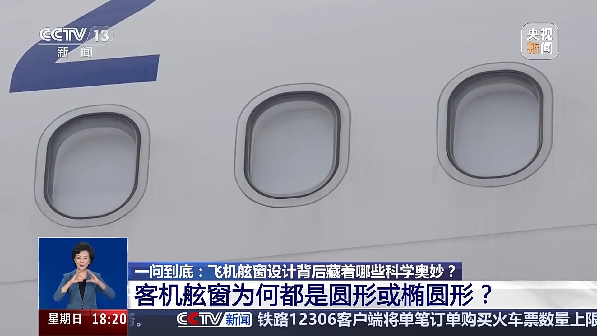 *東航技術虹橋基地空客航線一分部技術經理 劉建輝:*圓形的話它壓力是分散的,設計上是安全的,最大程度上緩解蒙皮上的承載壓力。另外一個圓形對旅客來説也是比較好的,有一個弧線視角,比較大,所以説後期的飛機全部改成圓形了。