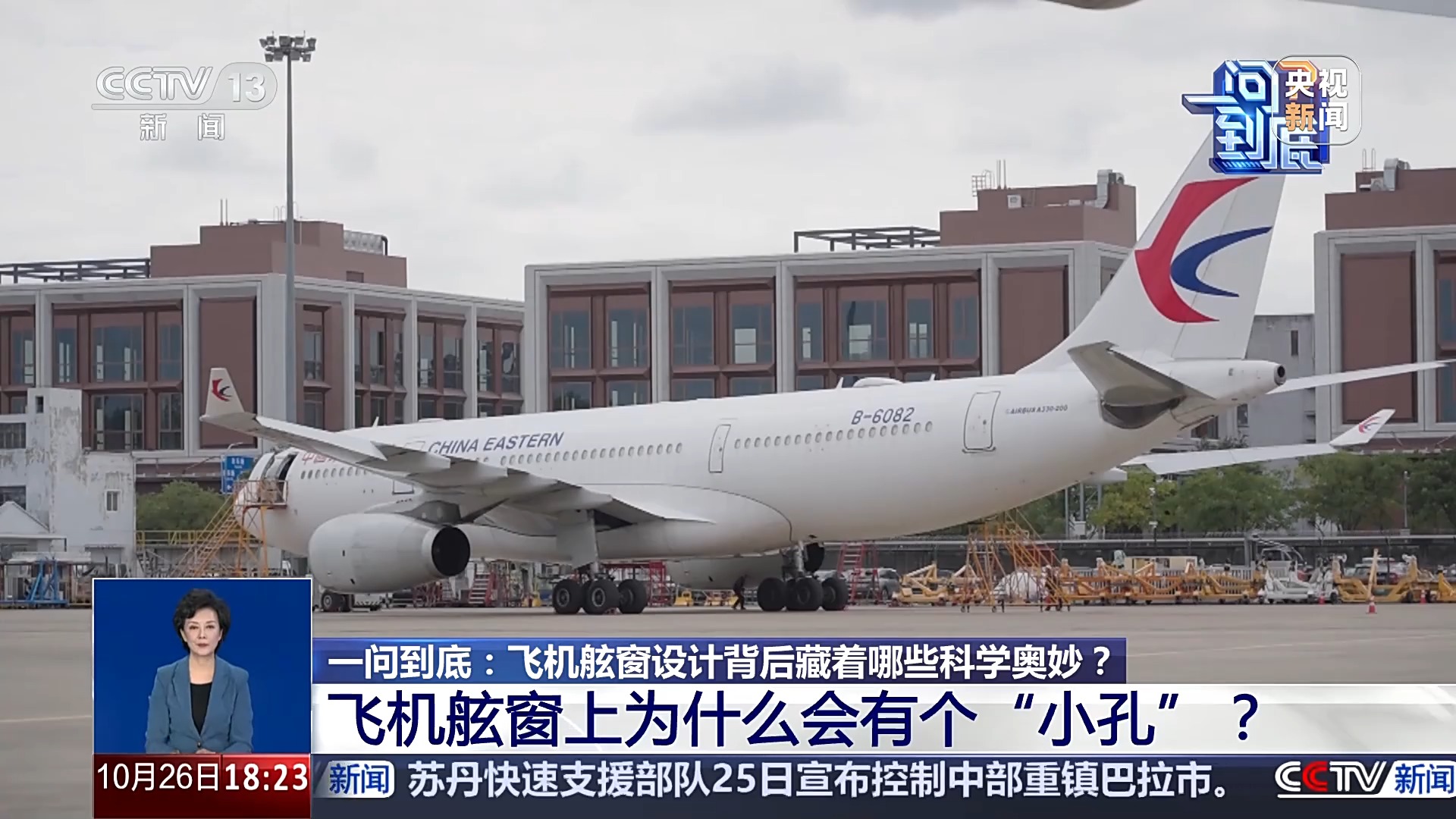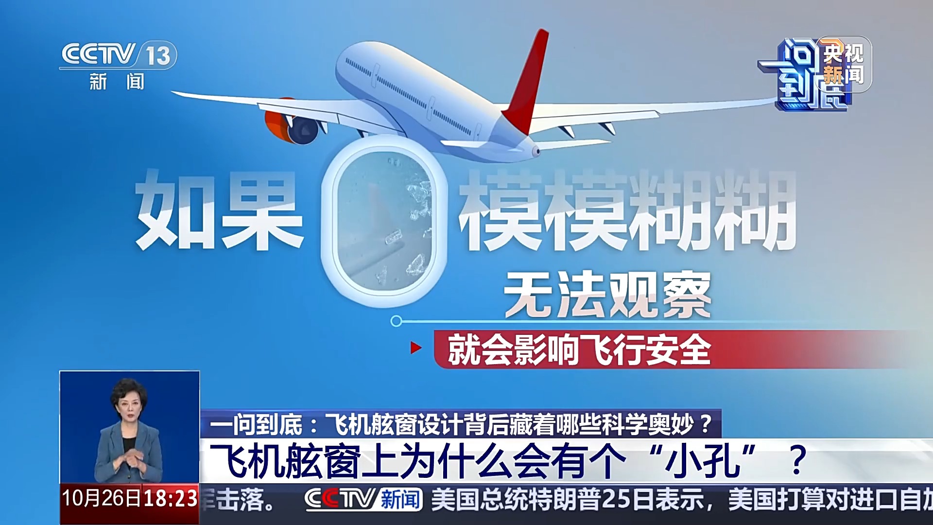 *東航技術虹橋基地空客航線一分部技術經理 劉建輝:*飛機窗户有三層,最外層叫結構層,它承載了大概在巡航高度上90%的壓力,中間層承擔一部分的壓力,它主要的作用是保護外層。靠近旅客的這層就是裝飾層、防磨層。在空中的時候外界氣壓是比較低的,大概0.2個帕,小洞其實就叫泄壓保護孔,內外壓差比較大,小孔的話就會平衡內層跟外層的一個壓力。