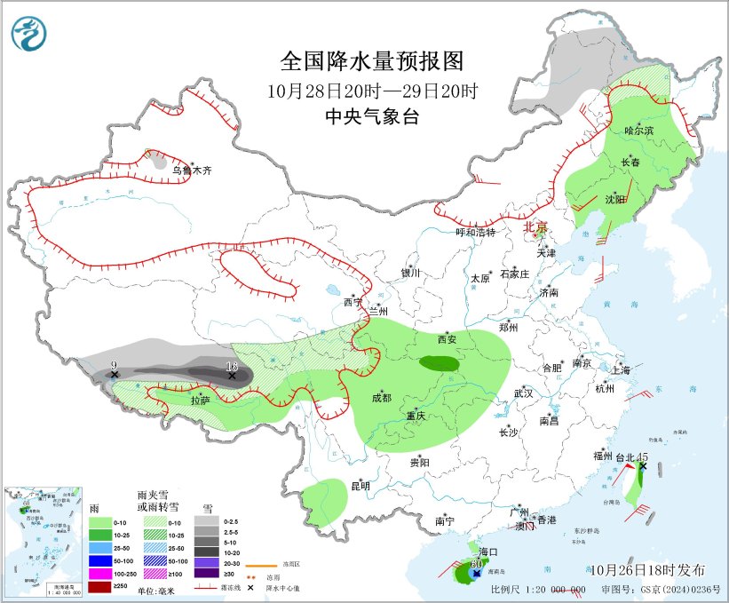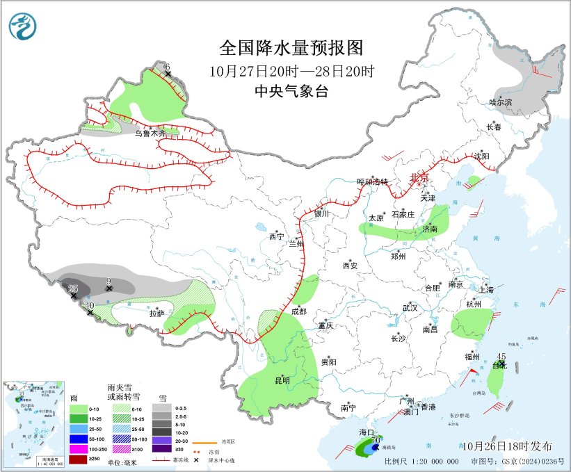 *10月26日20時至27日20時,*內蒙古東北部、黑龍江大部、川西高原北部、新疆西北部等地部分地區有小雪或雨夾雪,其中,黑龍江中北部等地部分地區有中到大雪。西南地區中東部、海南島、台灣島等地部分地區有小到中雨,其中,海南島東部等地部分地區有大雨、局地暴雨(見圖1)。