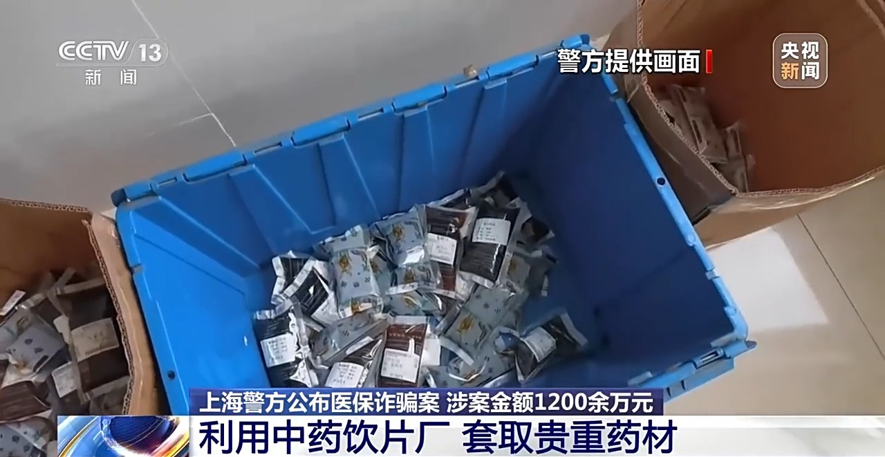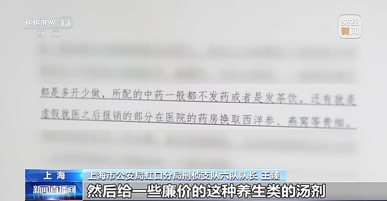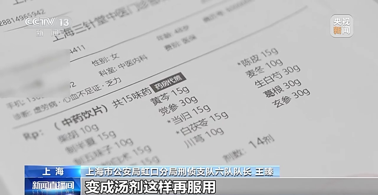 *上海市公安局虹口分局刑偵支隊六隊隊長 王臻:*開配一些名貴的,比如説黨蔘、鹿茸等等一些比較名貴的中藥材,然後給一些廉價的這種養生類的湯劑、養生類的茶飲,這個配方其實成本只有一塊錢。但是他每一次在醫院裏面配出來這種中藥,基本上都要上千塊。