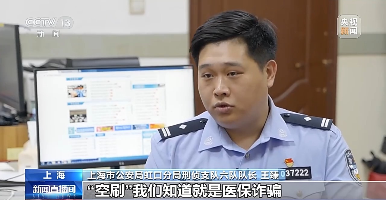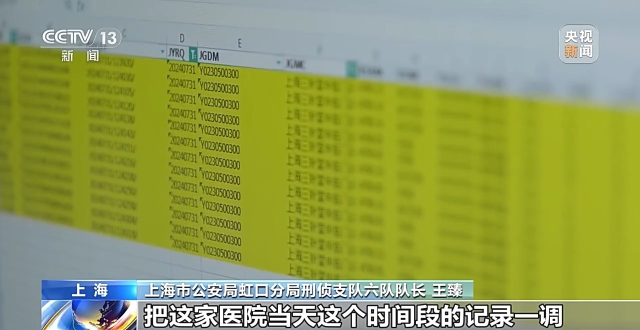 *上海市公安局虹口分局刑偵支隊六隊隊長 王臻:*因為我們眼睛看到的是3個人進去掛號,那按照道理來講,你這個時間段應該只有3個人進行掛號,進行就診,進行配藥。我們跟市醫保局聯繫,把這家醫院當天這個時間段的記錄一調,發現當天有15個左右的這個參保人在裏面有記錄,遠高於這個數字。