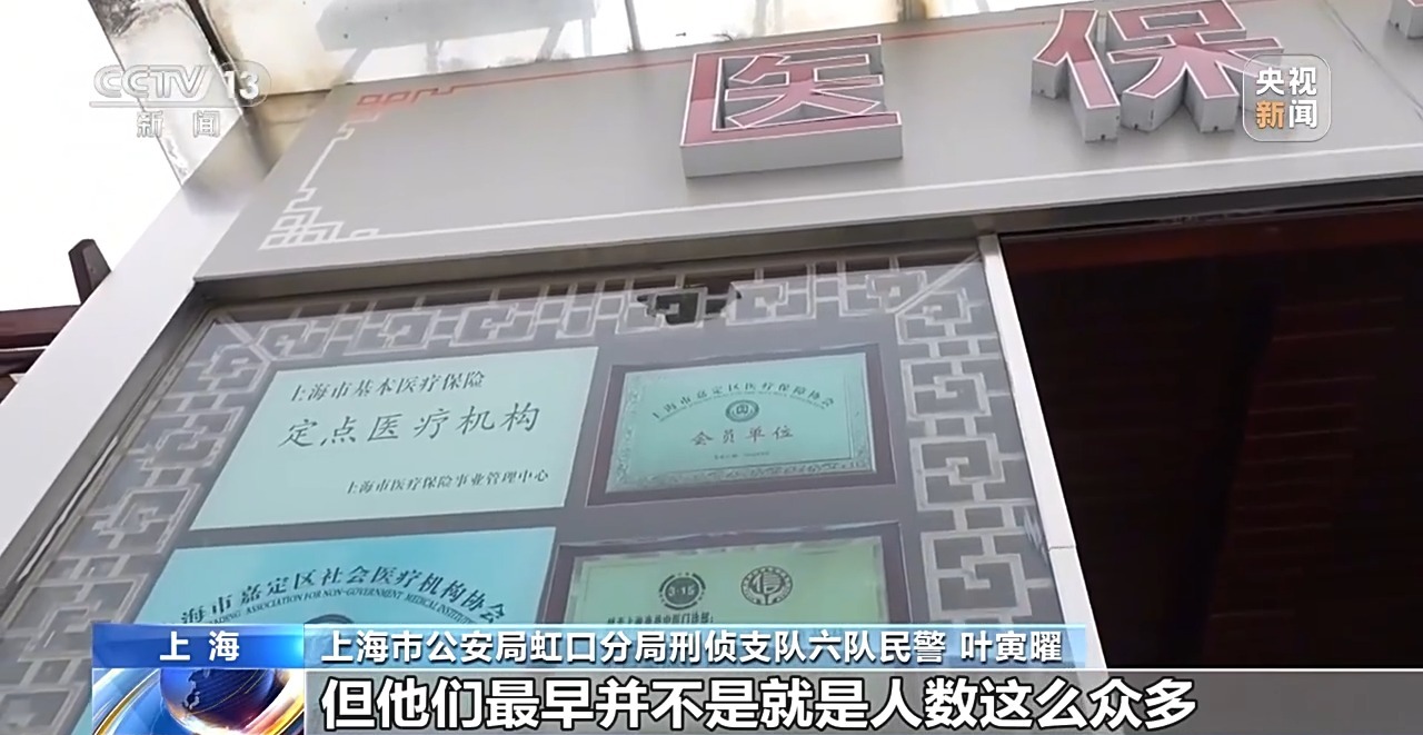 *上海市公安局虹口分局刑偵支隊六隊民警 葉寅曜:*逸養中醫醫院是從2021年開始,但他們最早並不是人數這麼眾多,只是比如説醫院的股東,包括他們股東家屬這方面的,自己的醫保卡在裏面空刷,到後面才發生就是叫老頭老太太一起去刷這個行為。
