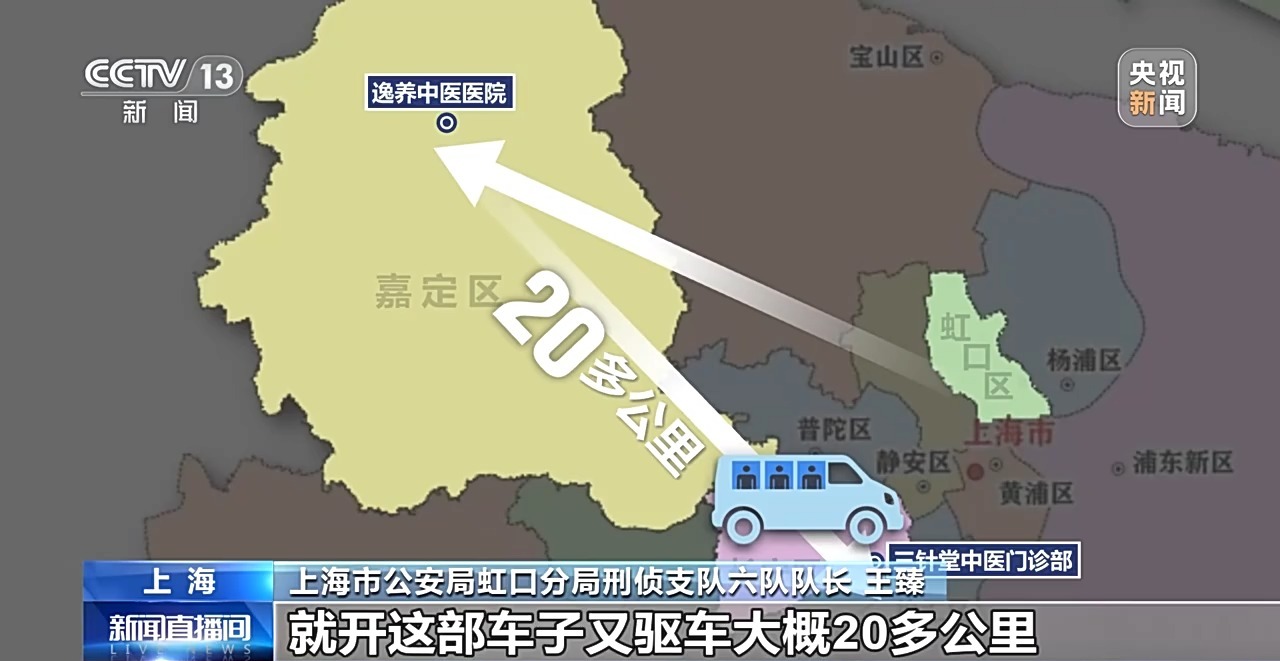 *上海市公安局虹口分局刑偵支隊六隊隊長 王臻:*這個人本身每天早上基本上是在六七點左右從虹口的住地出門,開一輛7人座的商務車,一路從虹口開往嘉定逸養中醫醫院門口停車場停好,陸陸續續地會有一些嘉定本地的一些參保人員上了他那輛車。上完車之後,就開這部車子又驅車大概20多公里,跑到了上海長寧區的一家叫三針堂中醫門診部。