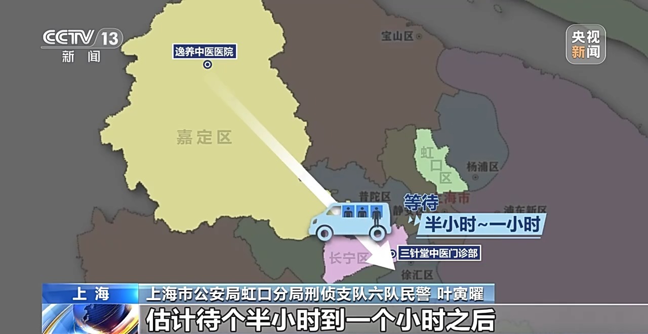 *上海市公安局虹口分局刑偵支隊六隊民警 葉寅曜:*每車接大概6到7個老頭老太太,就是很固定的時間段,每天接送大概一個多小時。接完之後這些人在三針堂醫院待的時間並不是很長,估計待個半小時到一個小時之後,就又從長寧市區這個醫院回到嘉定逸養醫院。