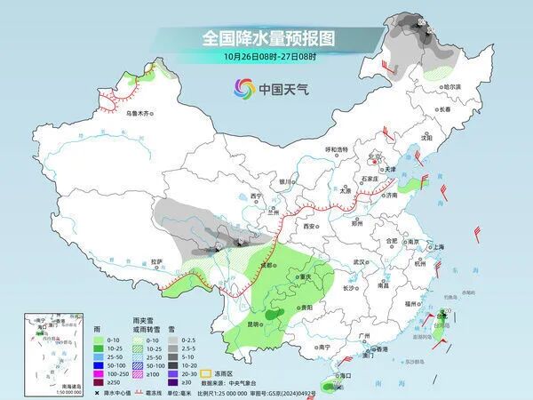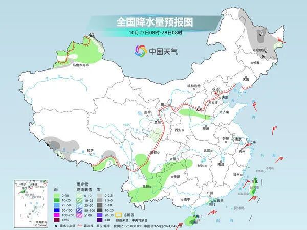 明天,新疆阿勒泰山區、西藏南部、黑龍江大部、川西高原北部等地部分地區有小到中雪或雨夾雪,局地大雪。