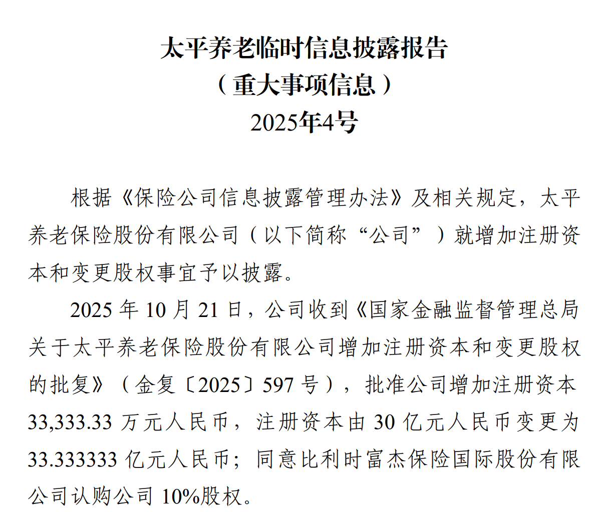 根據公告,太平養老已收到金融監管總局的批覆,批准其增加註冊資本3.33億元,註冊資本由30億元增至33.33億元。同時,同意比利時富傑保險國際股份有限公司(以下簡稱“比利時富傑”)認購公司10%股權,由此,比利時富傑成為太平養老第二大股東。