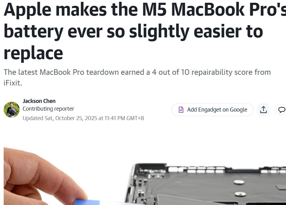 【環球網科技綜合報道】10月26日,據engadget報道,專業維修機構iFixit最新拆解報告顯示,蘋果M5芯片版MacBook Pro在可維修性上取得了微小但意義重大的進步——首次實現了無需拆卸觸控板即可更換電池。然而,這一改進仍未能改變其維修困難的本質,該機型最終僅獲得10分鐘4分的可維修評分。