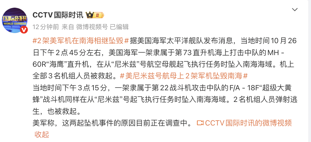 據美國海軍太平洋艦隊發佈消息,當地時間10月26日14時45分左右,美國海軍一架隸屬於第73直升機海上打擊中隊的MH - 60R“海鷹”直升機,在從“尼米茲”號航空母艦起飛執行任務時墜入南海海域。機上全部3名機組人員被救起。