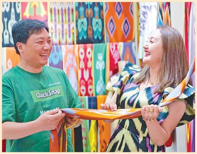 在新疆和田市吉亞麗人艾德萊斯綢店裏,工作人員(右)向遊客展示艾德萊斯綢。和田市委宣傳部供圖