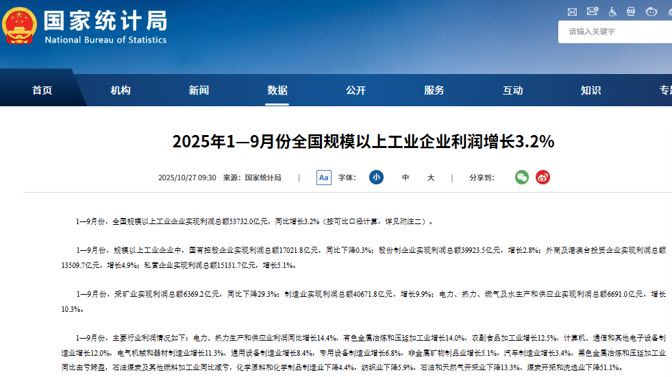 【環球網財經綜合報道】國家統計局10月27日發佈的數據顯示,2025年1—9月份,中國規模以上工業企業利潤呈現加快恢復態勢,利潤增速繼續回升,新質生產力發展動能強勁。