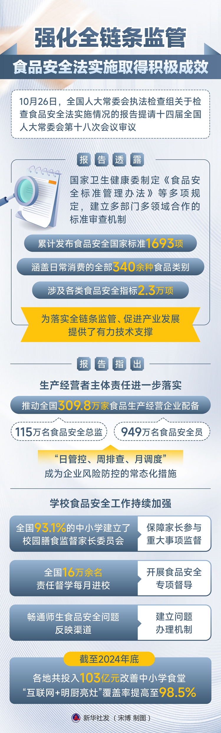10月26日,全國人大常委會執法檢查組關於檢查食品安全法實施情況的報告提請十四屆全國人大常委會第十八次會議審議。報告指出,食品安全法實施取得了積極成效,我國的食品安全形勢持續穩中向好,同時仍面臨一些問題和挑戰,要加強和改進食品安全監管工作,全面提升食品全鏈條質量安全保障水平。