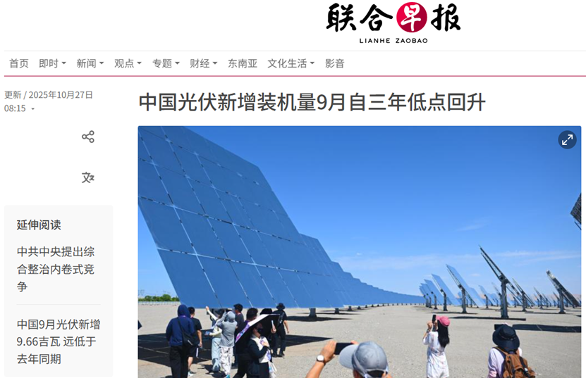 《聯合早報》近日發文稱,中國9月太陽能光伏新增裝機量相較於8月的近三年低點有所回升,達到9.66吉瓦,但仍遠低於去年同期的20.89吉瓦。這一增長主要受到5月政策調整前安裝高峯的影響。