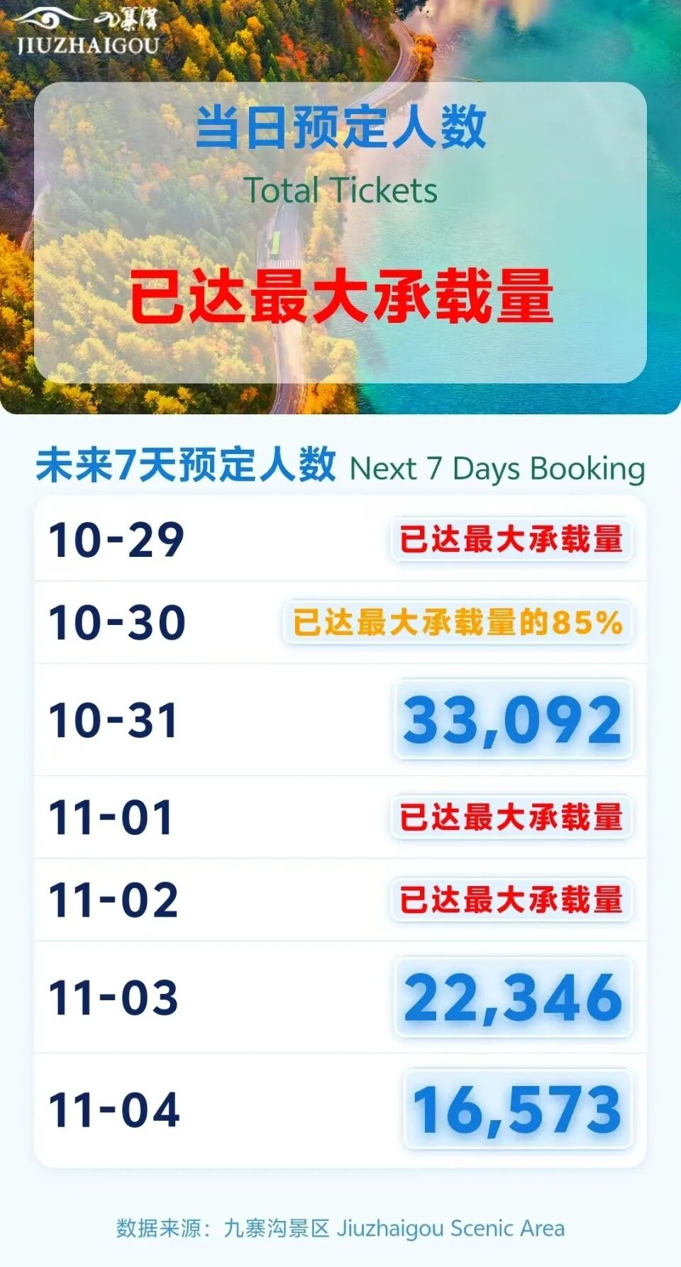 10月28日,未來7天預訂人數。 圖/九寨溝國家級自然保護區管理局