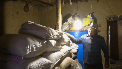 村民羅布家的糧倉裏,一袋袋青稞碼得整整齊齊。看着這些粒粒飽滿的青稞,羅布臉上充滿豐收的喜悦。