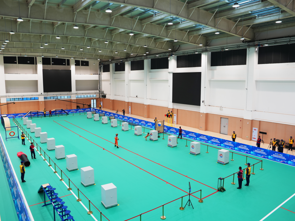 廢墟搜救模擬地震災害事故現場,採用“2人2犬”組合模式,由1公里負重攜行和人員搜救兩部分組成,在20分鐘內連貫完成。場地設置在地震救援搜索訓練場內,總佔地面積4468㎡,由執裁區、指揮區、比賽區組成,內設54個藏人點,深埋點深度達到6米,場地表層模擬災害坍塌建築廢墟,還原真實災害現場環境。來自雲南消防救援總隊代表隊人犬默契配合,快速完成4處“被困者”點位,精準吠叫示警、標記流程,取得第一名好成績。