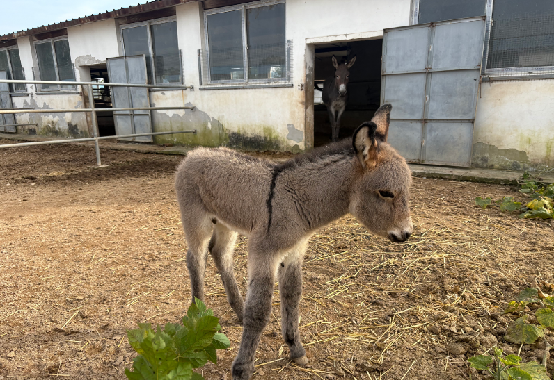 產房外,一頭母驢帶着一頭出生一週的小灰驢躺在地上曬太陽。憨態可掬的小灰驢一會圍着媽媽蹦蹦跳跳,一會兒在媽媽懷裏吃奶,一會兒又躺在地上表演驢打滾,十分愜意。
