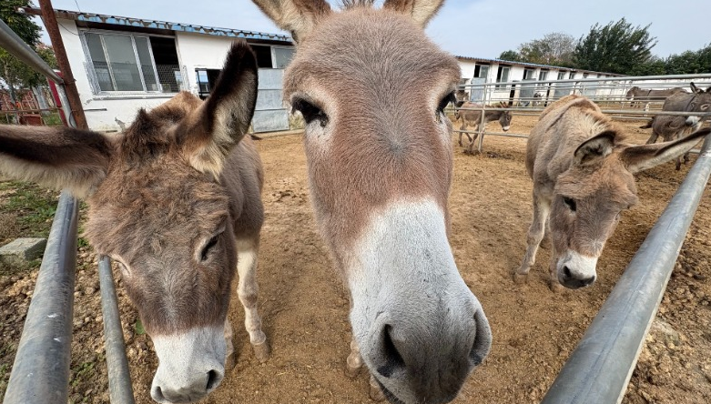 中午時分,淮北灰驢在驢舍外護欄圍起來的場地裏悠閒踱步。看到有人走近,它們以為有人投餵,紛紛湊上前來,發出高亢的嘶鳴聲。
