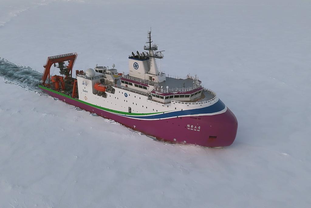 “探索三號”在北極密集冰區破冰航行。(自然資源部供圖)