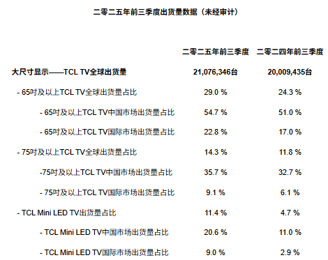 中國市場方面,受整體行業階段性調整影響,雖然2025年前三季度TCL TV出貨量同比下滑4.1%,但零售端表現仍然逆勢跑贏行業,且零售量及零售額穩佔市場前二[3]。與此同時,產品結構性增長動力依然顯著,TCL Mini LED TV中國市場出貨量同比大幅增長80.6%且其出貨量佔比同比提升9.6個百分點至20.6%,65吋及以上TCL TV出貨量佔比提升3.7個百分點至54.7%,75吋及以上TCL TV出貨量佔比同比提升3.0個百分點至35.7%。今年前三季度TCL TV在中國市場銷售均價同比提升3.4%,其中第三季度銷售均價同比提升8.1%。