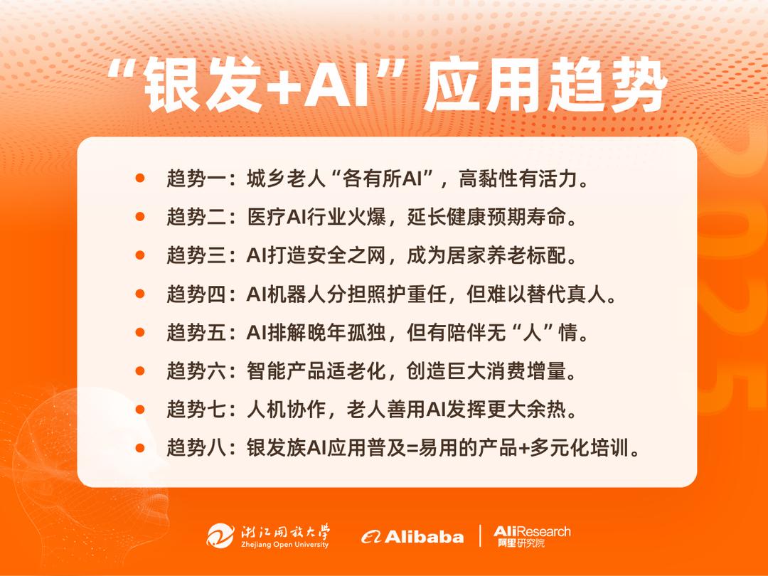 10月28日重陽節前夕,阿里巴巴聯合浙江開放大學發佈《2025“銀髮+AI”應用趨勢報告》。報告分析了我國老年羣體應用AI的現狀與趨勢,基於調研和數據提出:老年羣體是AI時代充滿潛能的深度參與者,將在居家養老、健康醫療、護理看管、情感陪伴、職業延續等場景全面收穫AI紅利。