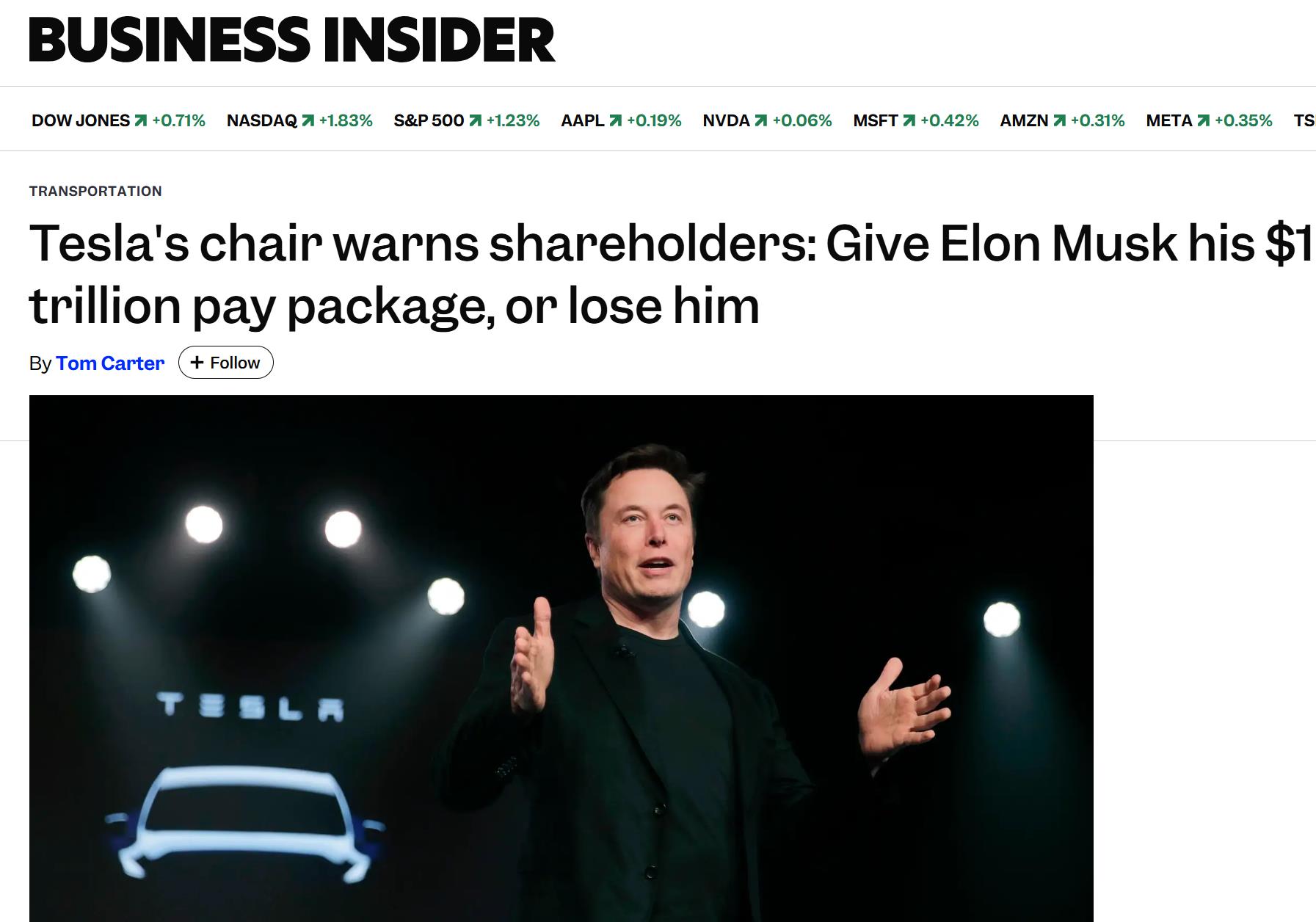 丹霍姆在信中表示,特斯拉正處於“關鍵轉折點”,並強調未能通過薪酬方案可能會導致馬斯克離職,特斯拉將失去“重大價值”。她寫道:“今年年度股東大會上股東們面臨的基本問題很簡單——你們是否希望埃隆繼續擔任特斯拉首席執行官,並激勵他推動特斯拉成為領先的自動駕駛解決方案提供商和全球最有價值的公司?”