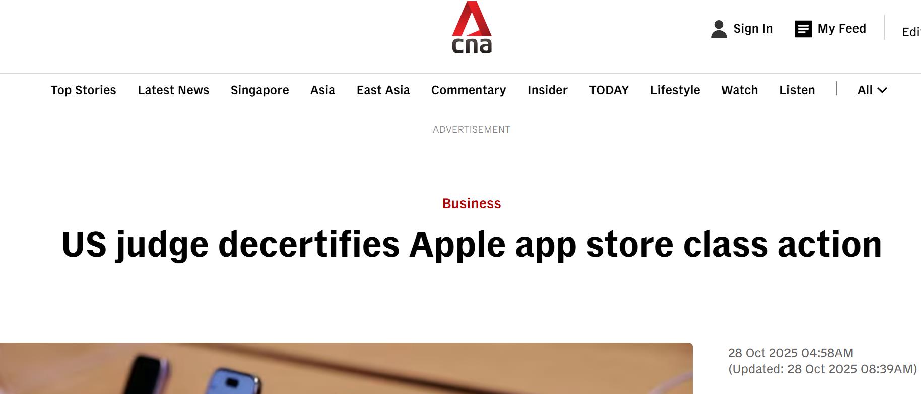 羅傑斯法官撤銷了她於 2024 年 2 月做出的集體訴訟認證裁決,該裁決允許過去 17 年內在應用程序或應用內內容上花費 10 美元或以上的蘋果賬户持有人以團體形式提起訴訟。
