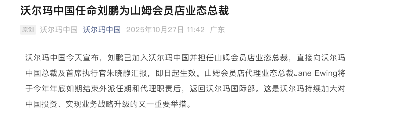 業內普遍認為,在零售行業競爭日趨複雜、會員制賽道從“規模擴張”走向“價值深耕”的關鍵節點,這位兼具全球視野、中國消費洞察與全渠道數字化基因的“零售老兵”的加入,不僅是一次高層人事調整,也是沃爾瑪中國在組織能力與戰略方向上的一次主動升維。