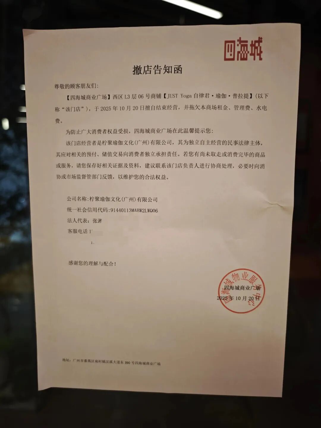 10月28日,“記者幫”來到番禺區四海城“just yoga”門店,發現此處大門緊閉,上面張貼着物業公司的封條。物業公司的《撤店告知函》中稱,該門店於2025年10月20日擅自結束經營,並拖欠本商場租金、管理費、水電費。