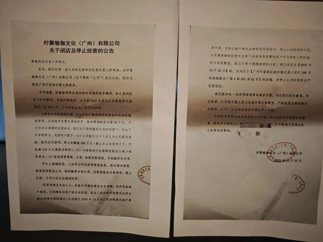 另一份由瑜伽館經營公司檸聚瑜伽文化(廣州)有限公司(以下簡稱“檸聚瑜伽”)《關於閉店及停止經營的公告》中則指出,公司自2022年成立以來飽受虧損困擾,至2025年,公司現金流已完全枯竭,在種種努力後,公司仍然經營不善,遂擬於2025年10月向人民法院提交破產清算申請,並自2025年10月20日關閉店鋪,停止公司所有的生產經營活動。