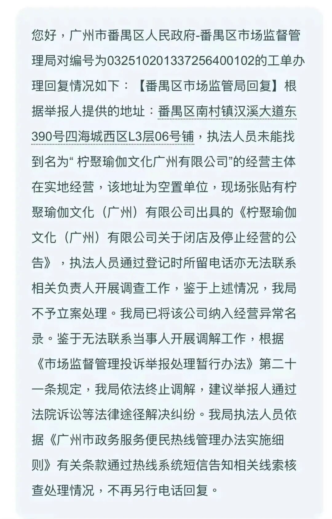 馬女士稱,不少學員也已撥打12345熱線求助,不過收到的相關回應同樣是“不予立案”。根據馬女士提供的截圖,番禺區市場監管局就此事回覆稱:根據舉報人提供的地址,執法人員未能找到名為“檸聚瑜伽文化廣州有限公司”的經營主體在實地經營,該地為空置單位……執法人員通過登記時所留電話亦無法聯繫相關負責人開展調查工作,鑑於上述情況,我局不予立案處理。我局已將該公司納入經營異常名錄……建議舉報人通過法院訴訟等法律途徑解決糾紛。