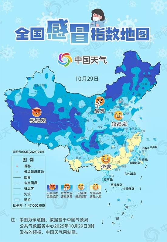 10月31日,北方大部感冒風險仍處於易發水平,且四川盆地、貴州等地降雨範圍擴大,在雨水打壓下,冷感加重,也易感冒。河北、河南、江蘇、安徽等地晝夜温差較大,部分地區可超10℃。鄭州、合肥等地最高氣温都在20℃左右,但最低氣温僅有10℃上下,温差大較易引發感冒。