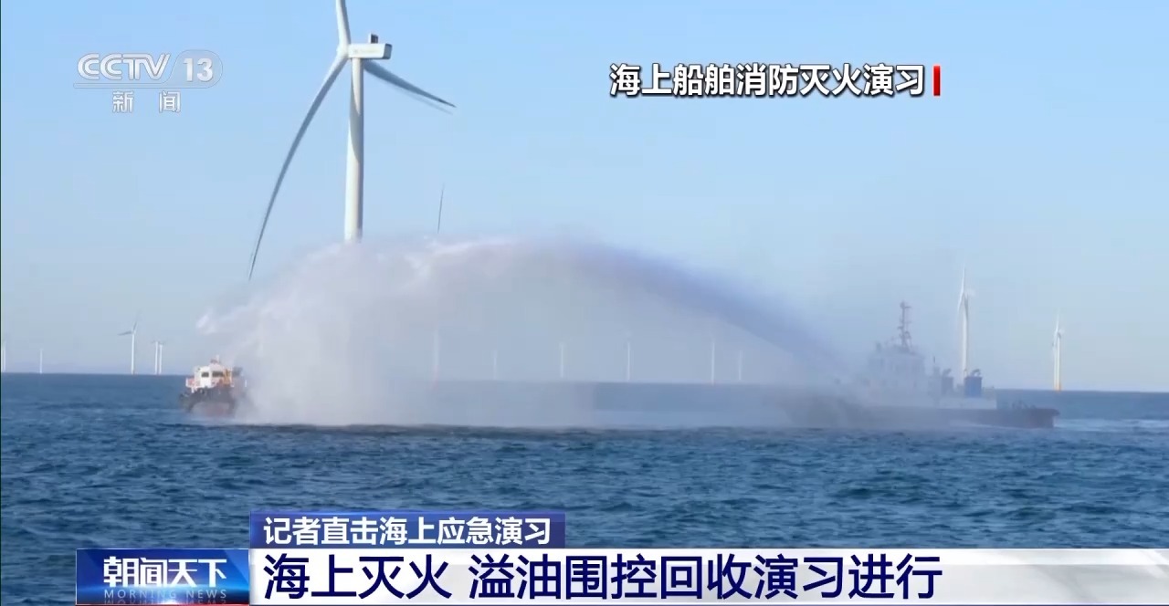 *總枱央視記者 古峻嶺:*現在正在演習的項目是海上消防滅火。工作人員在一艘船上放起了模擬火災時產生的煙霧,另外兩艘船隨即展開對着火船隻的消防滅火作業。