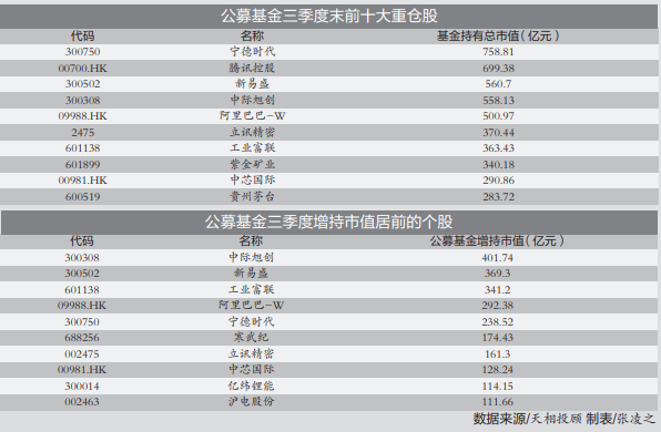 位列公募基金第三到第十大重倉股的分別是新易盛、中際旭創、阿里巴巴-W、立訊精密、工業富聯、紫金礦業、中芯國際、貴州茅台。截至三季度末,公募基金持有上述個股市值均超280億元。
