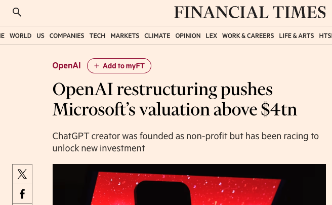 OpenAI完成歷史性重組:微軟獲27%股權,市值突破4萬億美元